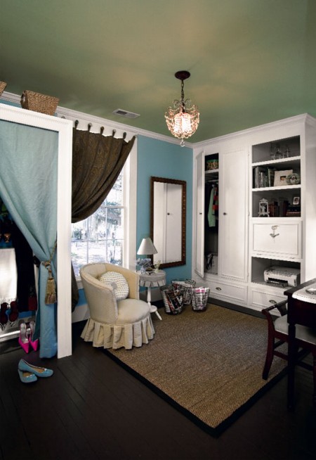 衣帽間是個相對獨立的空間,燈光考慮不可少。設計師建議,選用一個自然光色的吸頂燈就可以,最好別用射燈,因為射燈溫度比較高,衣帽間屬于私密空間,燈光設計沒必要太炫,選擇一個顯色性好的日光燈,使衣服的顏色最接近正常,方便主人選擇就可以。如果衣帽間的采光不好,在穿衣時對衣服的選擇會產生色差,同時也會感到空間有壓抑感。衣帽間還需考慮空氣的流通,以避免在潮濕季節發生蟲蛀、發霉現象,尤其是由衛生間改造成的衣帽間,在當初改造時最好不要動原有的排風管道,同時裝上排氣扇,讓室內空氣形成對流。