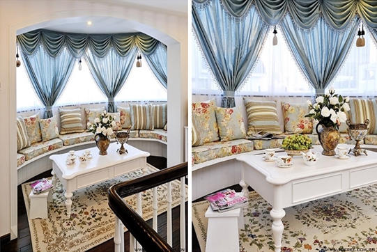 戶型的客廳陽臺也是整個家居中的一大看點,通過溫和的色調來提升空間的舒適度。華麗的窗幔以及沙發、抱枕的搭配,自然中流露出一股清新、怡人的生活氛圍。