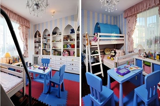 二樓的兒童房設計有點偏向于清爽型的地中海風格,裝飾柜用很夢幻的迪斯尼尖頂造型。整面墻都是做了儲物設計,藍白條紋的背景墻以及粉紅色的窗簾顏色,柔和型的搭配很適宜兒童房顏色的搭配法則。